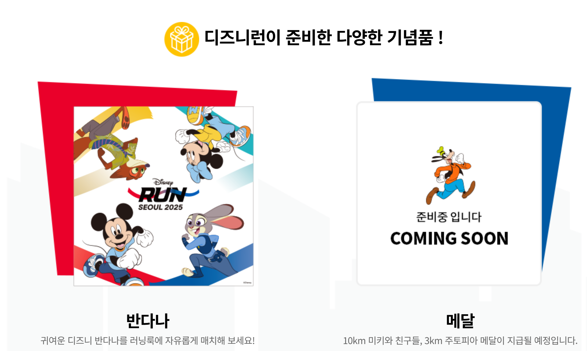 디즈니런에 참가하면 디즈니 캐릭터가 새겨진 한정판 메달과 티셔츠, 배번, 기념품 등을 받을 수 있습니다.