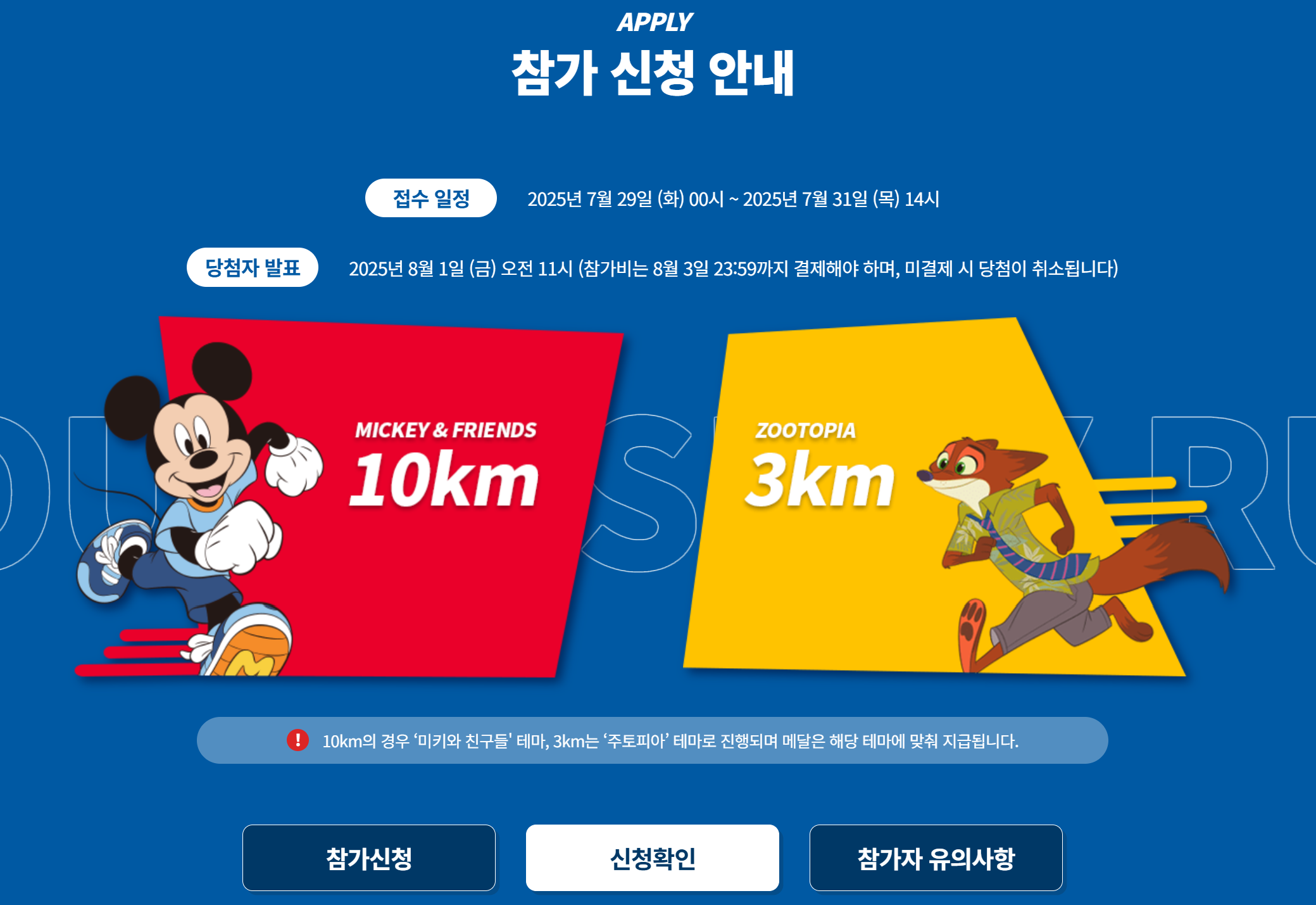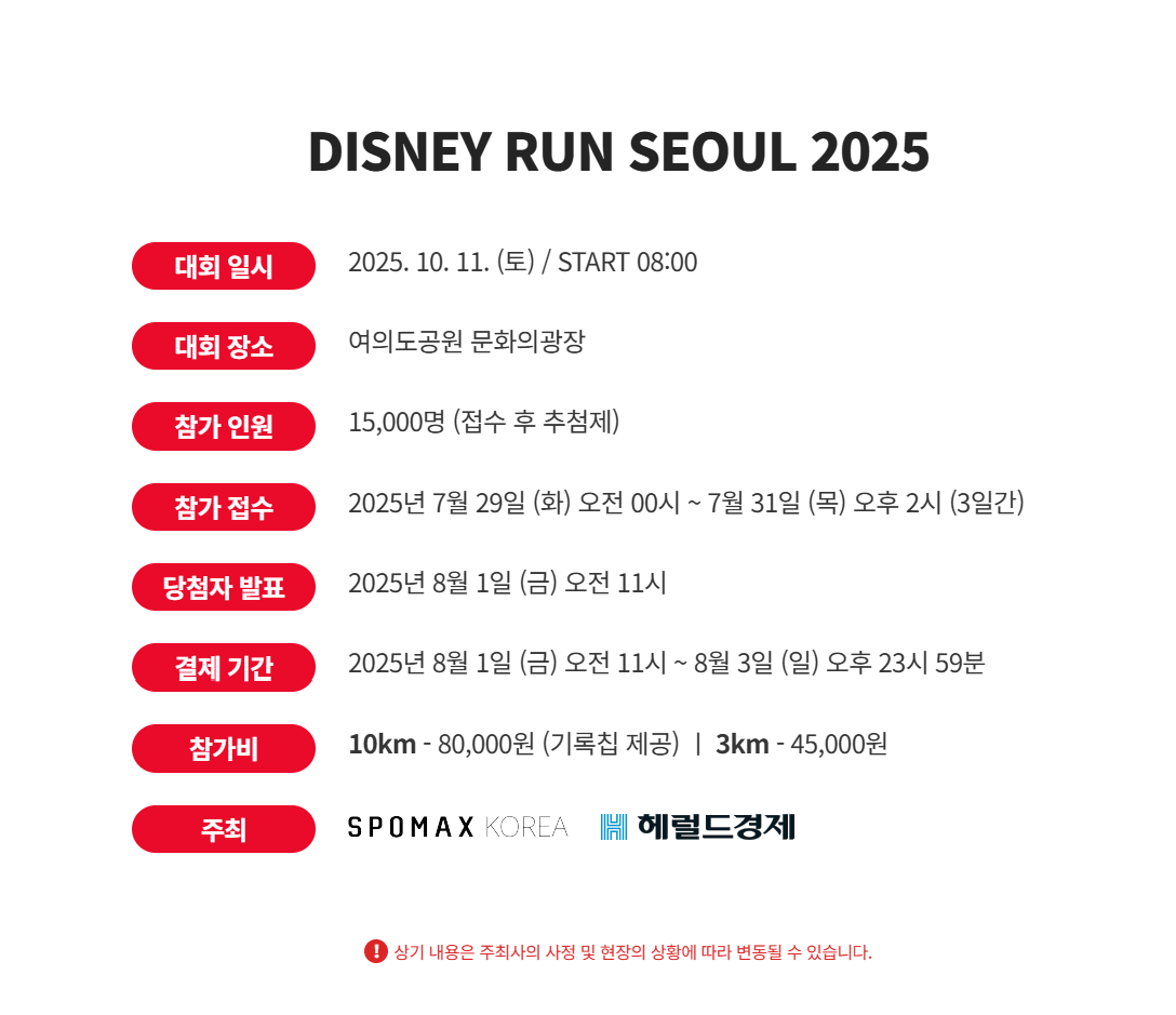 디즈니런 접수는 1인당 1회만 가능하며, 중복 접수는 자동으로 취소될 수 있습니다.