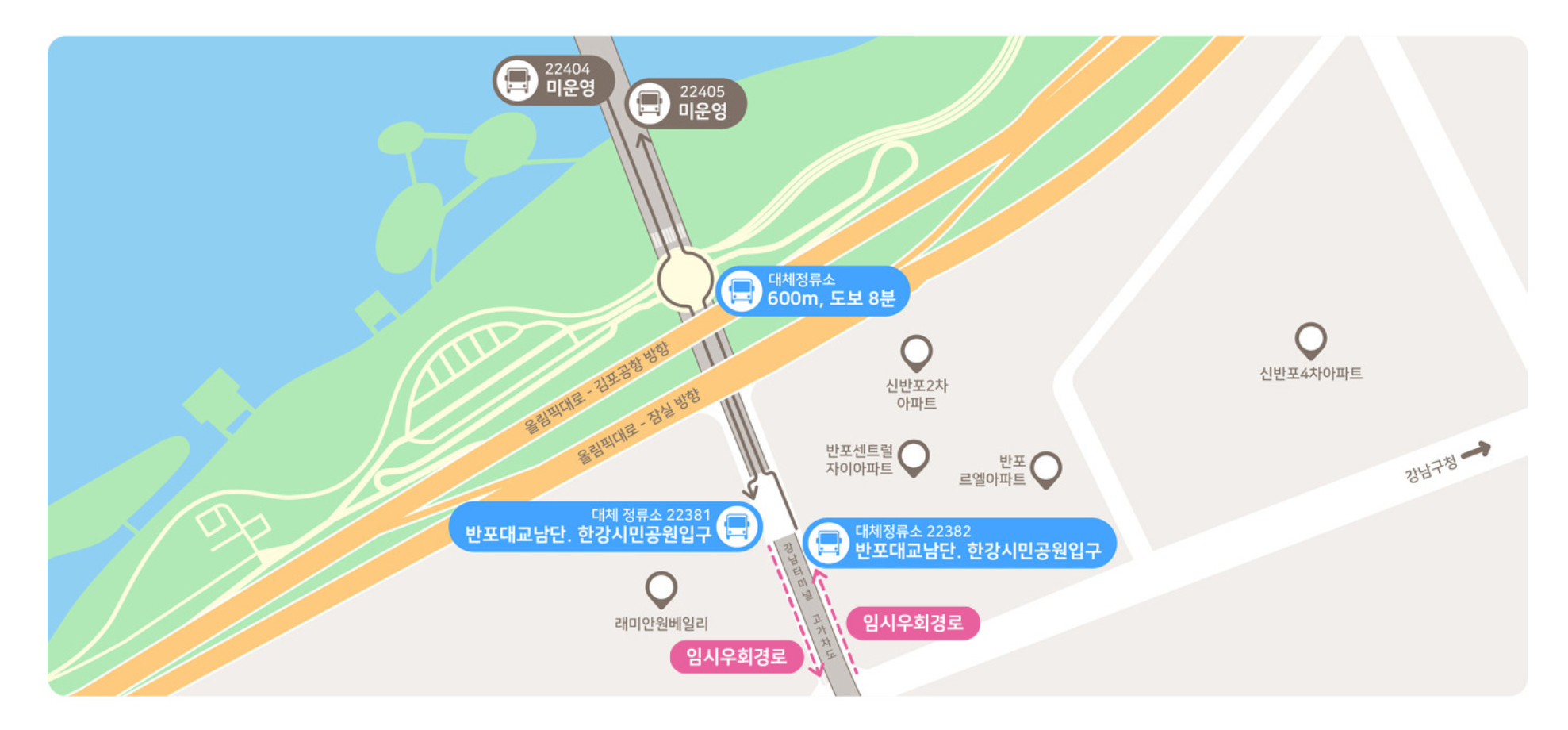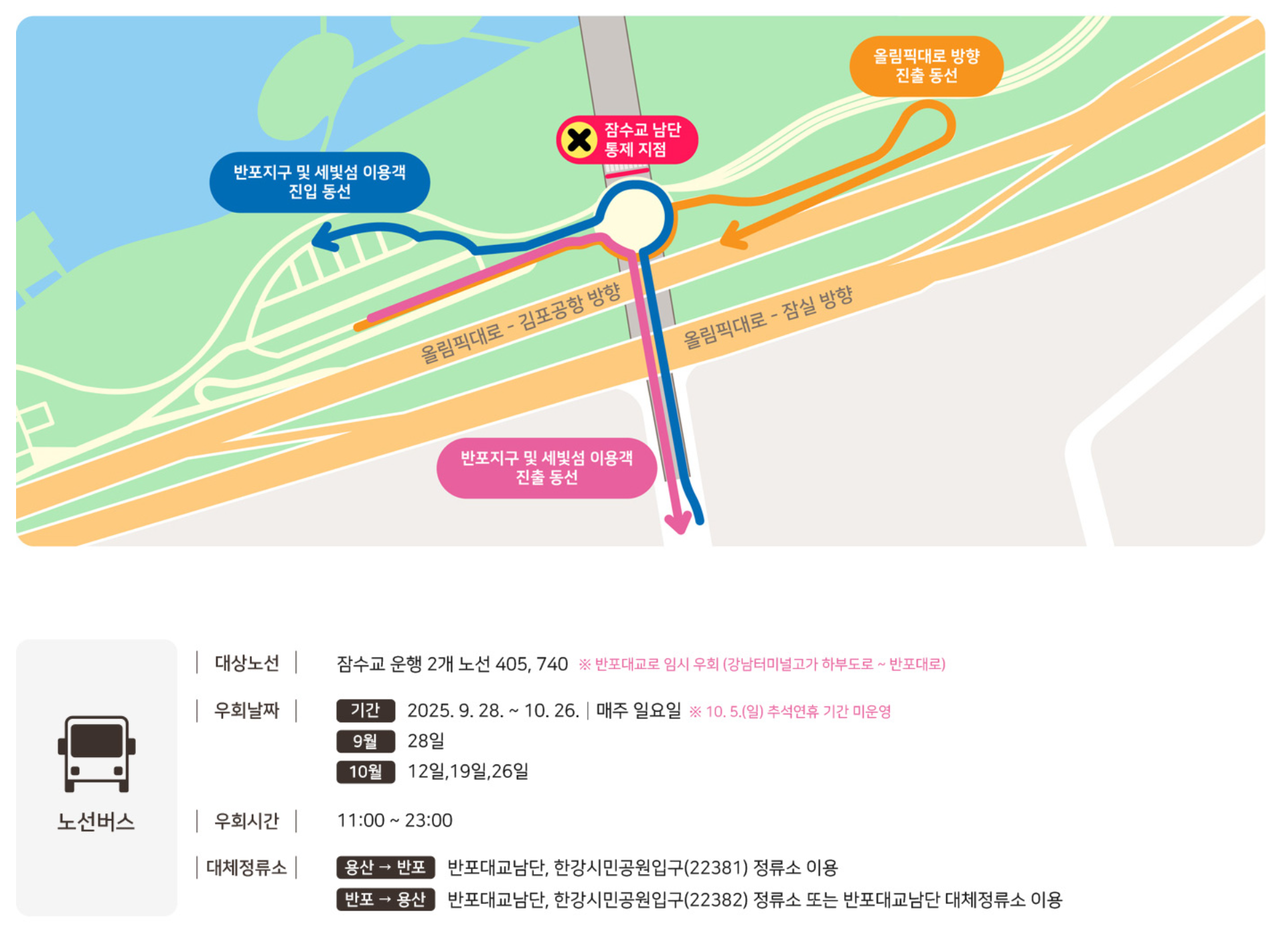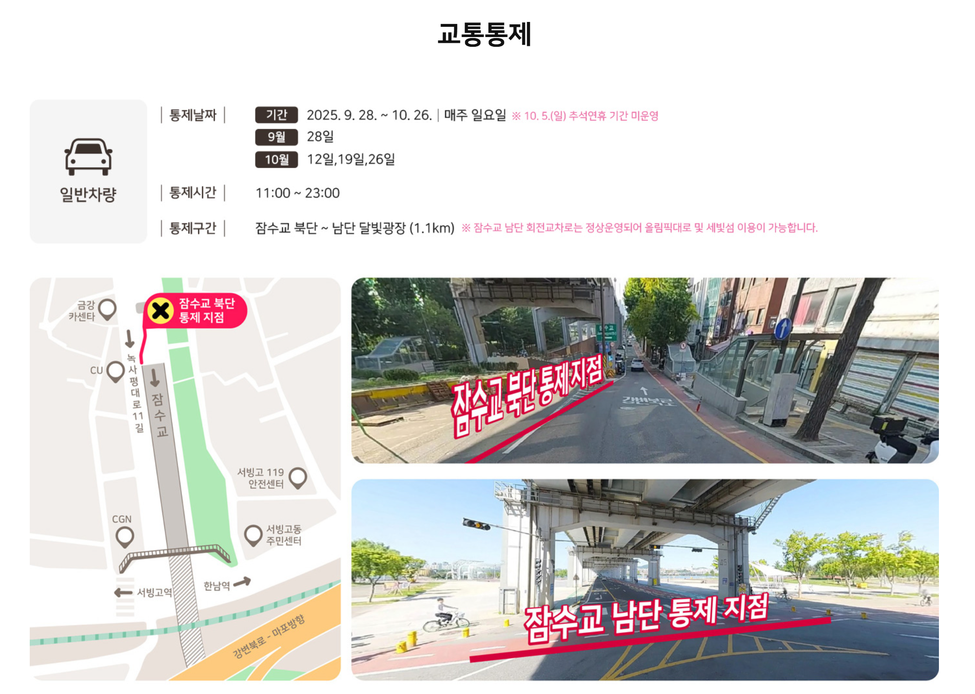 축제 당일 잠수교는 차량이 전면 통제되어 보행자 전용 공간으로 운영됩니다. 인근 도로 일부(여의대로 등)도 영향을 받을 수 있어 대중교통 이용이 권장됩니다.