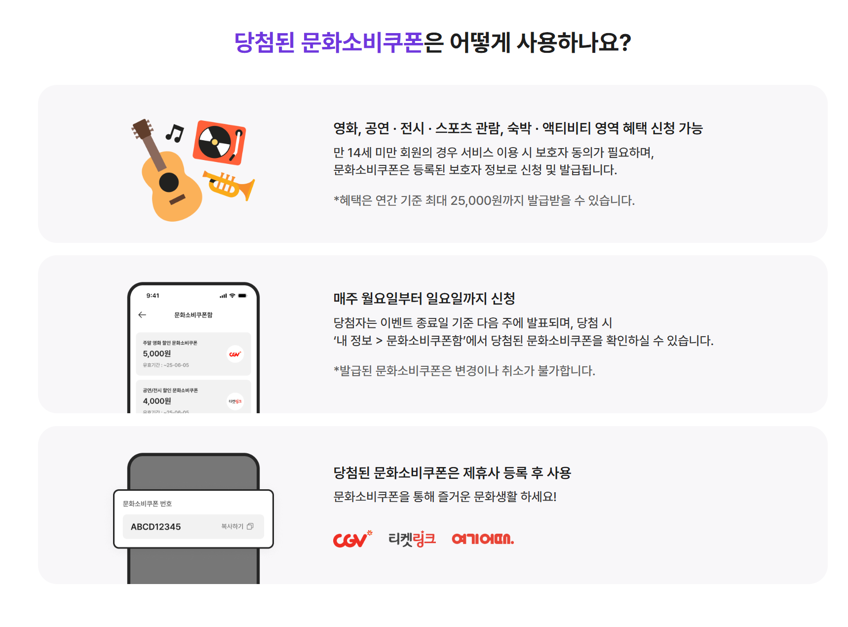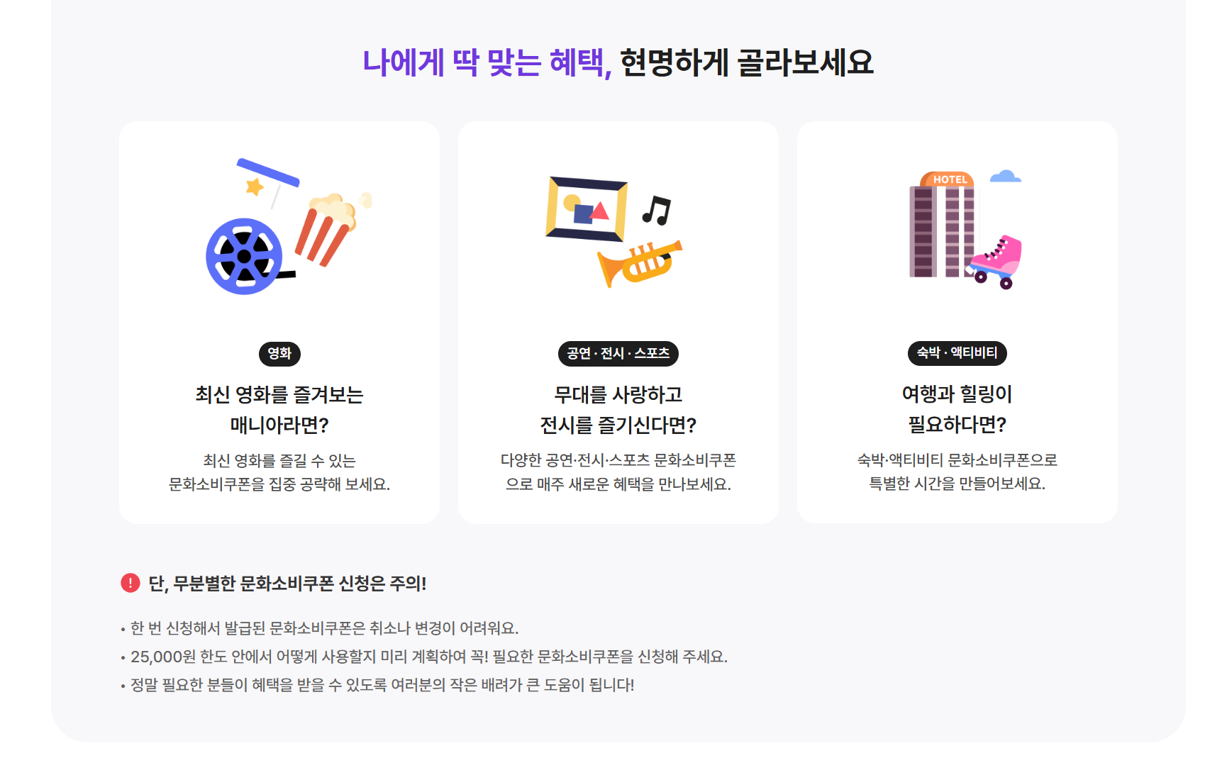 - 혜택 : 영화, 공연, 전시, 강좌 등 문화생활 지원