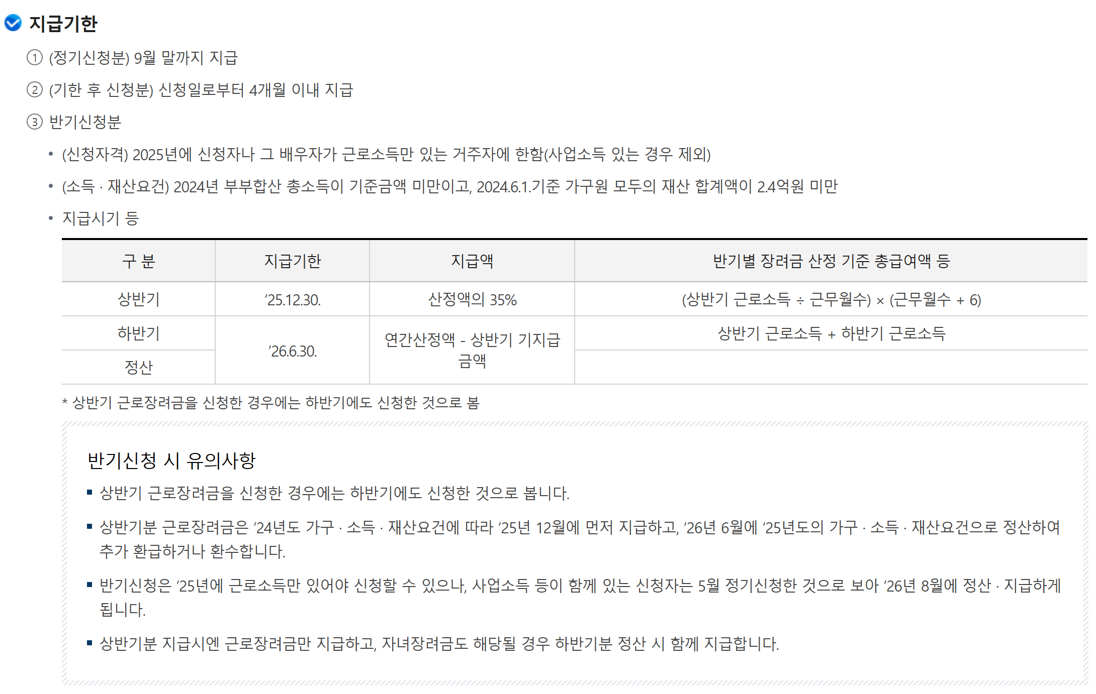 - 반기 지급일: 상반기 소득(5월 신청 → 9월 지급), 하반기 소득(11월 신청 → 12월 지급)