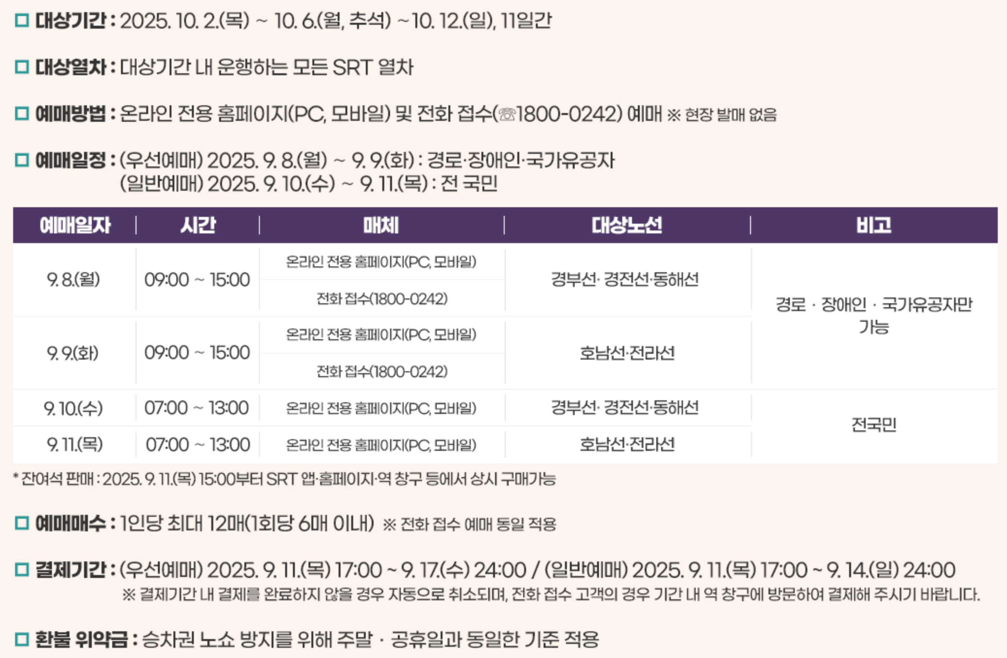 따라서 반드시 코레일·SR 공식 홈페이지 공지사항을 확인해야 하며, 예매 전날에는 알람을 맞추고 가족들과 역할을 분담하는 것이 좋습니다. “부모님은 PC, 자녀는 모바일”처럼 인력을 나누면 확률이 올라갑니다.