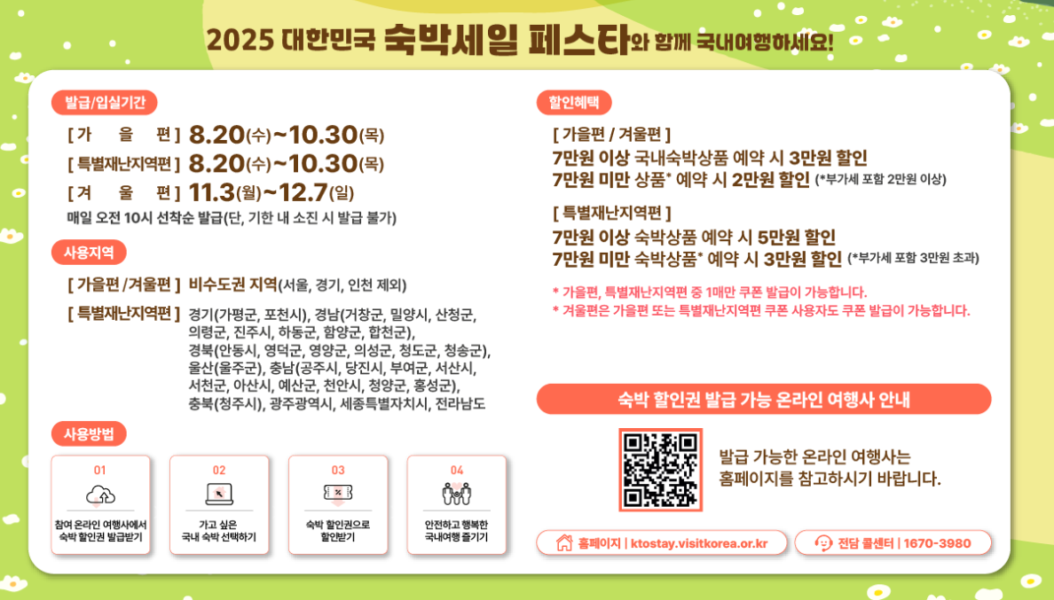 2025 하반기 숙박세일페스타는 전국 숙박업계를 활성화하고 국내 여행 수요를 높이기 위해 정부·지자체·온라인 여행사가 함께 진행하는 대규모 숙박 할인 행사입니다. 이번 가을·겨울 시즌 총 80만장 숙박할인권을 배포하여 합리적인 가격으로 여행을 즐길 수 있도록 지원합니다.